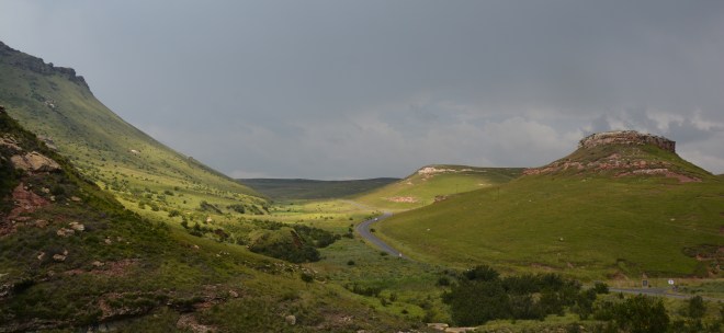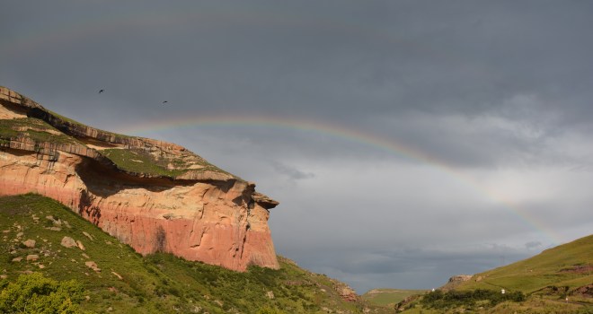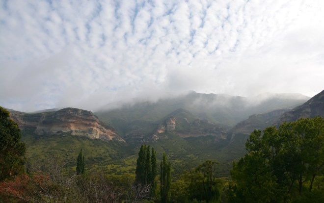 Changeable weather rolls about these high places. We’re at 2000 metres. Oddly, I’ve spent most of the past nine weeks or more at that sort of altitude: the Kenyan highlands, around Mount Elgon, Nairobi and Johannesburg and now the Drakensburg. From here I’ll also go up to Lesotho in due course, also at altitude. Tonight there’s heavy rain after a day of scudding clouds, bright sun, sharp breezes, rainbows and chilly winds. It’s a fine landscape. And close by is Lesotho, most magical heart of the globe.