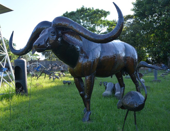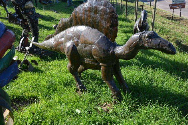 We drove out to look at the sculptures that a Zimbabwean, Lazarus, is creating outside Durban. “It was your input that persuaded us to take this route,” Mike says as we pull into Lazarus’s workshop, from which he generally makes and sells garden ornaments of considerable creativity. Welded steel, much of it recycled. All of it with very ‘African’ characteristics. Some of the dinosaurs are currently stored amongst his other wares in his extensive grounds. They are terrific! And the whole team, and clients are thrilled by the look of them, the African quality and the folk references. Lazarus has worked to sketches and briefs, his results signed off by the palaeontologists at the university. I’m happy I encouraged this lively, artistic sculptural solution. And I’m happy to help a skilful Zimbabwean too. I admire that nation above almost all other Africans.