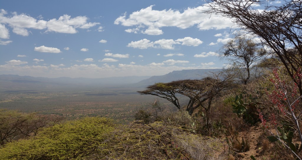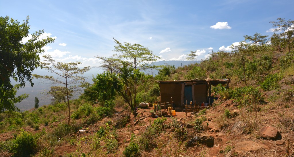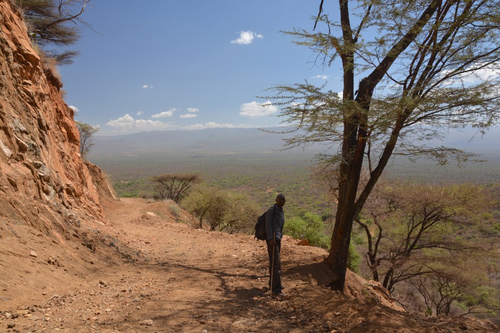 We are nearing the bottom of the escarpment now. We’ve been scrambling down for about three hours. The app on my phone – the only thing I like about said iPhone – indicates that we have descended 2650 feet. We stop in the shade of a scraggy tree, perhaps another 50 feet to go to till the earth levels out again and we can walk with straight legs. A woman lives here; William says that she looks after his mother’s goats. His family has a good deal of inherited land on these final slopes into the valley. “What do you eat here?” William calls down to the woman. She’s burned almost black by the harsh sun and pared to the bone: a thin black shadow of a woman. “Especially veggytable?” She points upwards, such that I need no translation, and replies that all fresh produce, if she can afford it, comes from climbing to the top of the escarpment, back to the Kessup plateau from which we’ve just slithered. All that way for 50 bob of green local vegetables and a bag of maize flour for the inevitable starchy ughali.