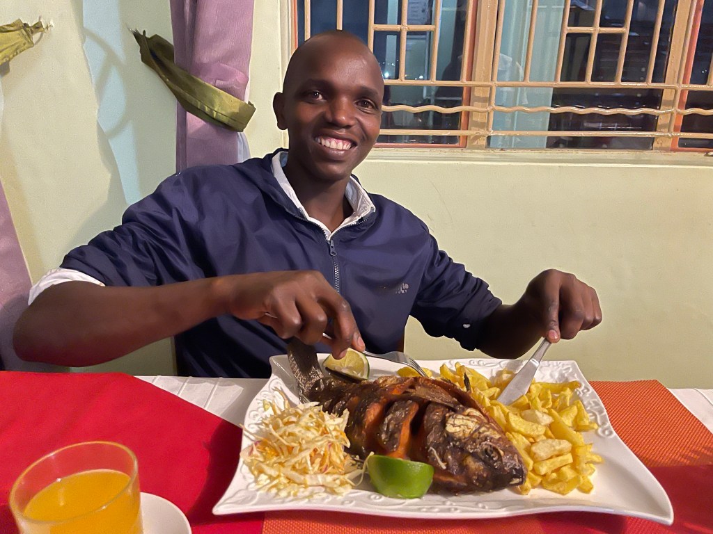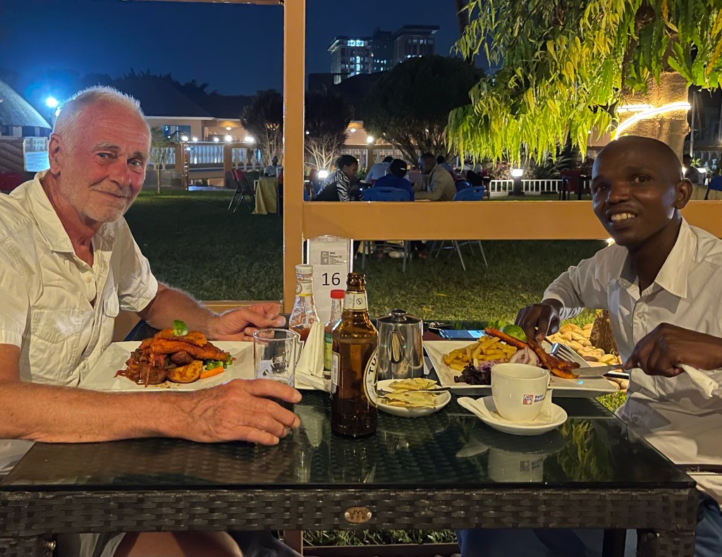 Alex lived and worked in Kampala for six years. He was deputy manager of food and beverage in the smart, upmarket Africana Hotel, one of the city’s best. I suggested a visit and supper in the gardens. He was pleased. It’s a huge city centre place, concrete and glass on a small hill with views over the horror that is Kampala. Up here you are isolated from the mess and chaos, an oasis of western comfort where you can forget the squalor of this dying capital. The moment we enter the lobby, Alex is greeted. First off, to his gratification, is the general manager, a capable, efficient middle aged woman. “She always walked like me! Fast! She doesn’t rest, back here at five tomorrow morning. I was one of the only managers she allowed in her office!” It’s pleasing to see how this man, whom I befriended by instinct six years ago, and now treat rather like a son, was received with such warmth by his ex-colleagues. Many were still there, although it’s six years since Alex left and went back to Sipi. Now he’s carrying brochures for his own infant business and is smiling from ear to ear by the time we sit down for a beer in the garden (tea for Alex, who never drinks alcohol): he’s handed leaflets, the ones we printed today, to many ex-colleagues, including the marketing managers. They all promise to promote his small business, and seem to mean it. They respect Alex, and the fact that he is trying to make life on his own terms impresses them. When we leave, after a huge Lake Victoria fish dinner, cooked by his friend the chef, Obama, he’s happy and smiling. I’m happy for that too, I’ve come to respect Alex so much. We text a picture of us at supper in these salubrious surroundings to Precious, who’s jealous. “Eh, I am missing out!” Alex is concerned at the expense to my pocket. Two bottles of beer, a pot of African tea, and two huge fish fillet dinners in this oasis comes to £21. I reassure him. He’s so smiley it’s fun.