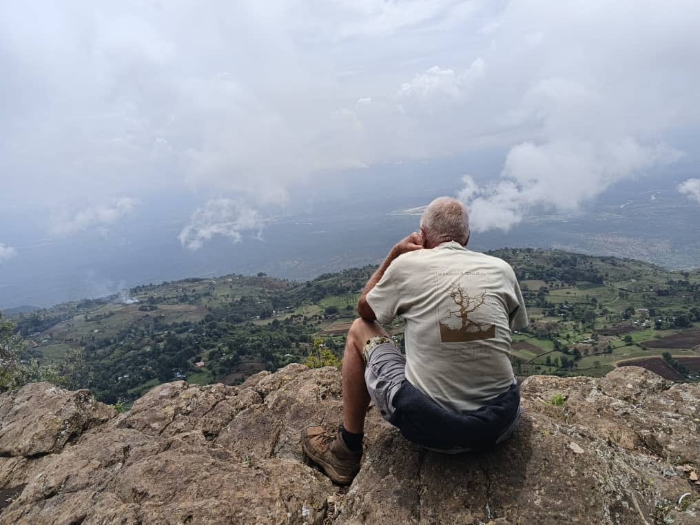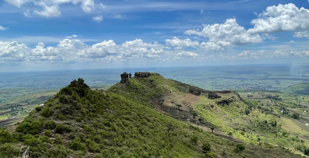 The loose rocky, gravelly path straight down the escarpment is horrible: slippery and steep. Stones roll away beneath our shoes and cascade down the slopes. And it’s no small descent. It’s a 2756 foot (840 metre) scramble. This bit does make me nervous. But ‘no risk, no story’. In record time, two hours, we reach the white rock road that traverses the bottom of the valley, the heat bouncing now off the track. Here at the foot of the escarpment it’s just smallholdings and the most delicious mangoes the world knows. We get tea and chapatis – our normal hiking fare – and stop a motorbike taxi to take us five kilometres along the tedious rocky road to the junction of the upward trail. There’s nothing to see on this white road and only dazzle and heat to endure.