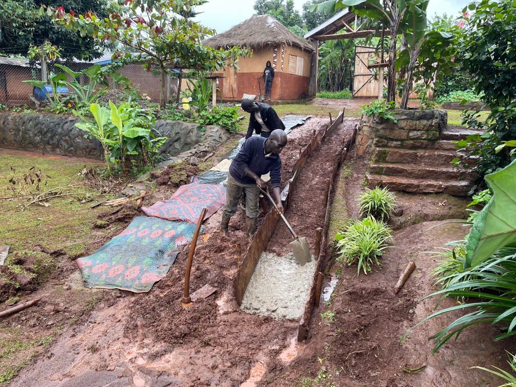 We are always developing the guesthouse. We must improve the landscaping to ease the rainy season mud for guests. Moses, the only worker here with whom I enjoy working, and two of the Chelel boys and I, move tons of earth and concrete to form pathways, a ramp and drainage gulleys. I work some more on the gardens. I wonder if the Harberton hollyhocks will survive in this climate? It’s SO fertile here in Uganda. If the government weren’t so dysfunctional and corrupt, this should be one richest of African lands. Plant a stick and in a month or two you have a bush. It’s glorious – and rewarding. Guests are delighted to find a garden, for flowers are little valued in most of Africa. They are considered useless, inedible and of no profit. Mostly, idle boys with their pangas just chop the heads off!
