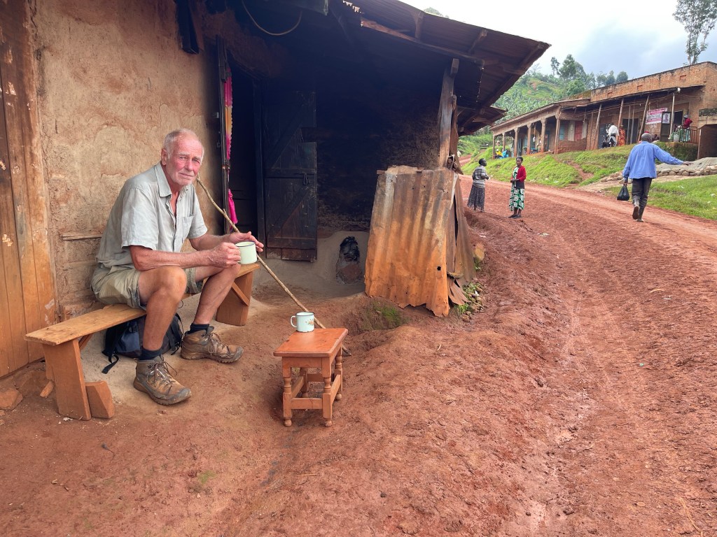 A tin mug of black tea and a greasy chilly chapati in a scruffy muddy village. I’m the biggest attraction in days. All gather. Alex is adept at the small talk required. One old man of 89 is respectful and charming, obviously a popular character. It turns out he worked with Alex’s grandfather back in colonial days in Kapenguria, Kenya, farm labouring for a white man. He’s pleased to meet Alex and tell his stories. Alex is a good conversationalist and the old man is happy with an audience.
