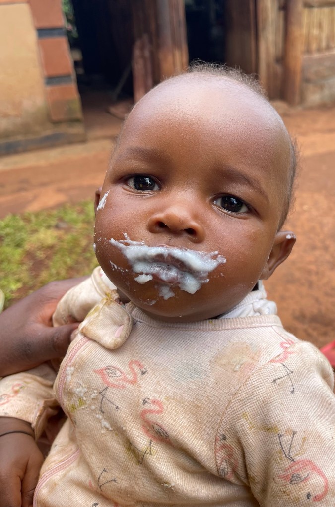 I find this amusing, then Alex reminds me how very few people reach even 70, let alone 77, in Uganda. 2% reach 70… So I am a phenomenon as well as a celebrity wherever we go in these rural communities, where everyone is so friendly and welcoming. Hundreds of children (no shortage in a land in which 50% are less than 14 years old) call and rush to look at the mzungu, shouting for siblings to come and see too. A few approach for a shy handshake, others run away in terror, some hide in mothers’ skirts, wailing.